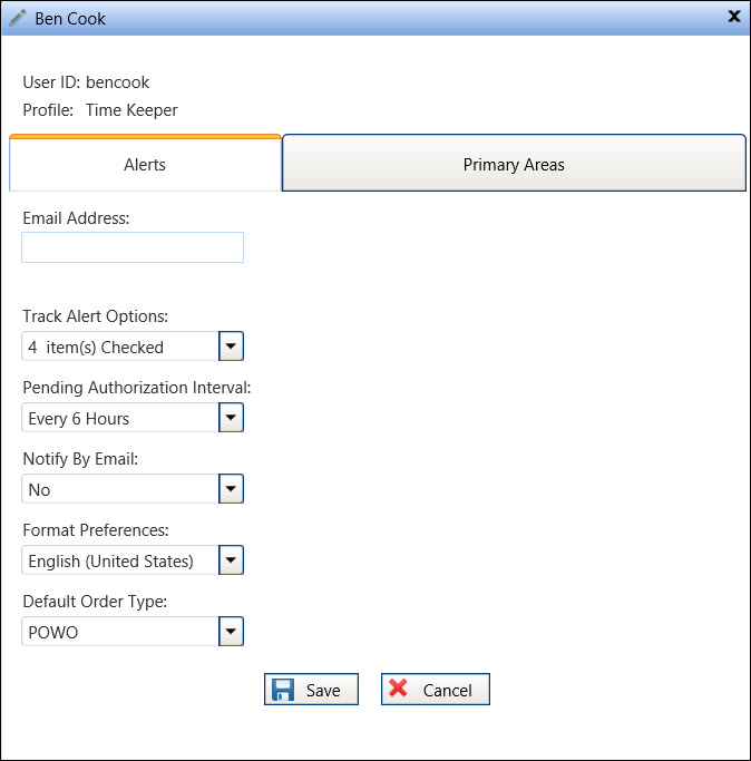 From the Alerts tab, enter or edit the user’s email address into the Email Address text box.