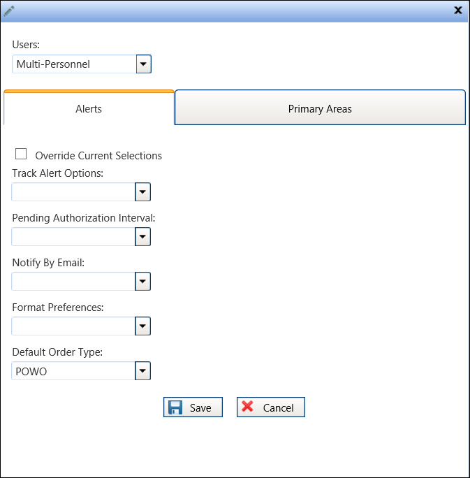 From the Primary Areas for Authorized Alerts area, click the Override Current Selections checkbox to override the users’ previous area ID selections. Keep in mind that any unchecked area ID will be removed if these area IDs were previously selected.