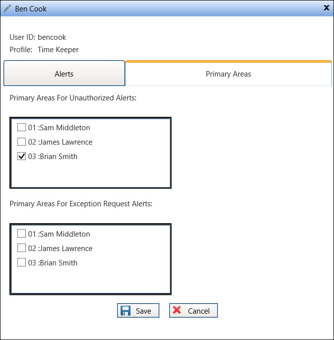 Select one or more area IDs from the Primary Areas for Exception Request Alerts area.